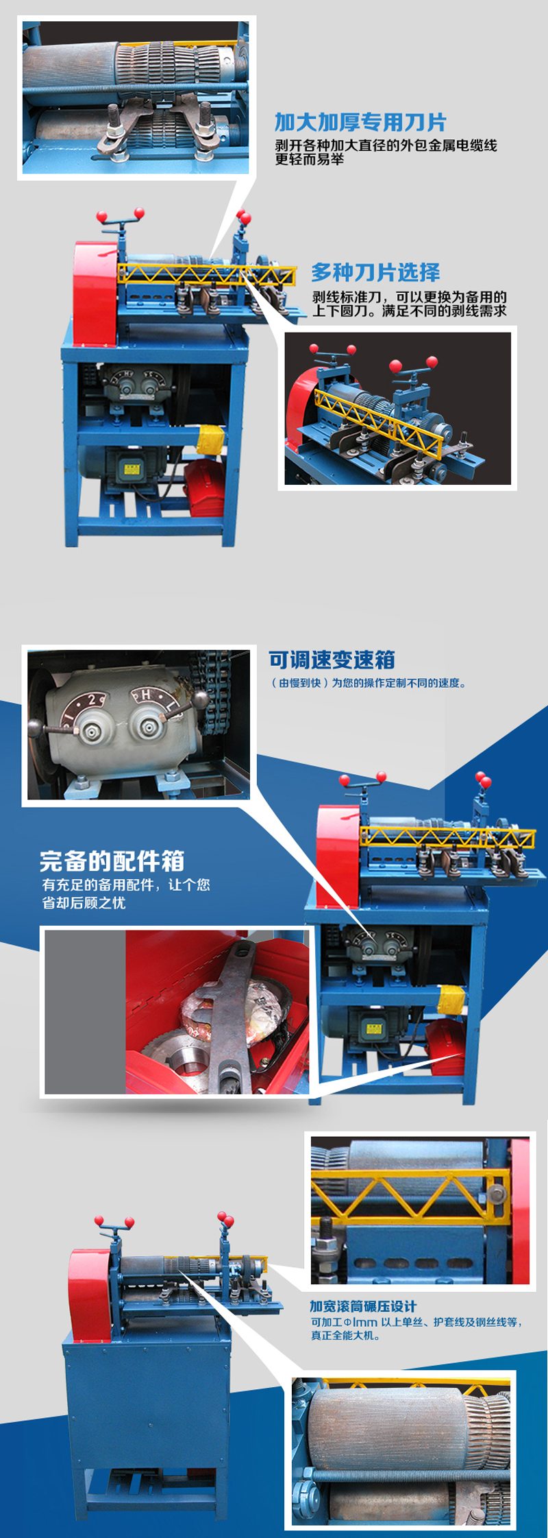 功能:本机适用各类1.5MM-100MM电线、是目前拆解行业广泛通用的剥线设备。滚筒剂压,左右装刀(长形刀),上下装刀(圆形刀片),此机的特点区别在于轴径加大,齿轮双排加固,双根链条等。上轴在作业时任意上下调节。