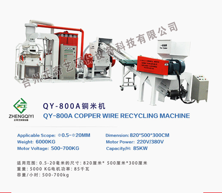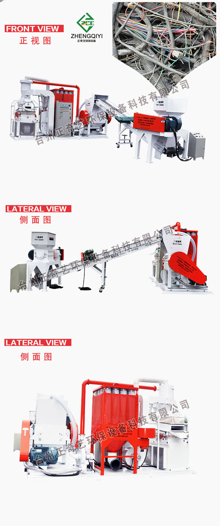 是专业干式分离废旧电线电缆的生产线。例如:旧汽车电路线,通讯电缆线,以及剥线机不适合加工(各种民用电线)废旧杂料电线.毛丝细线等.此机的特点是大小线不用分类可以同时破碎分离,结构新型、独特,生产量大,耗电少。分选率高,一次投料,多机协作完成。全线由PLC控制,在国内处于领先水平。该机的开发成功,即解决了焚烧取铜方法中出现的问题,又能提高回收铜的质量,并可将塑料回收利用,同时解决环境的污染。